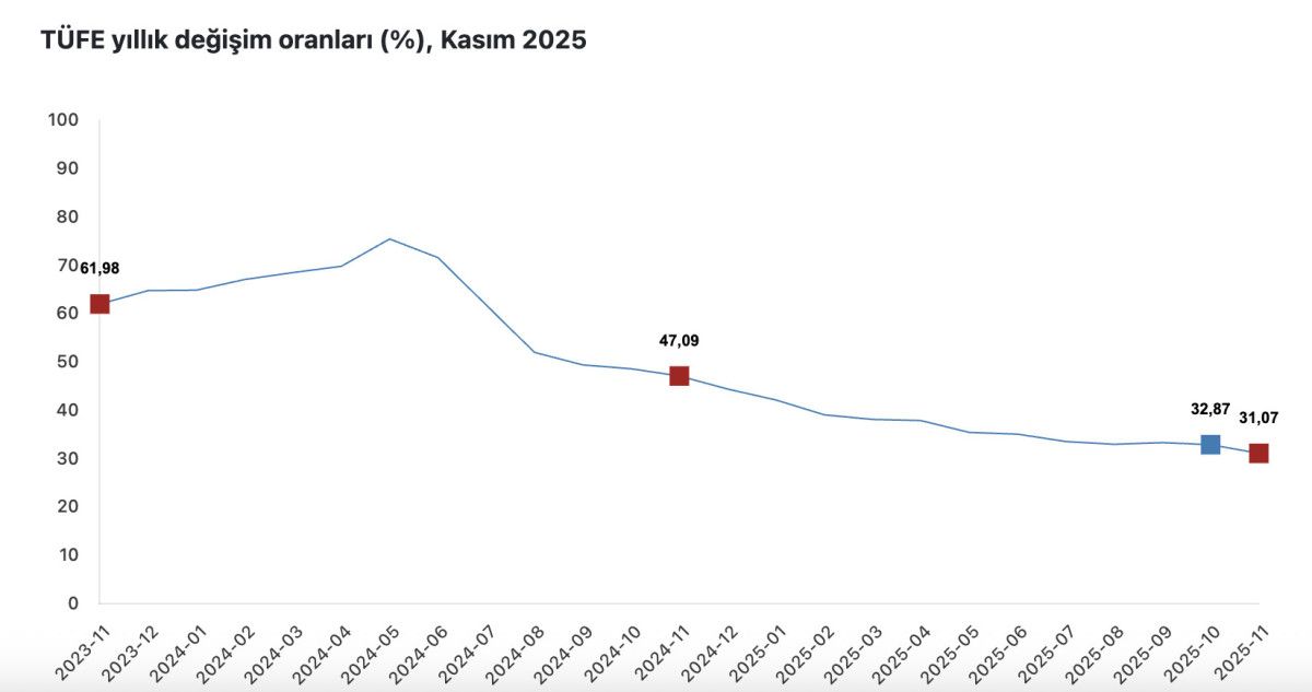 TÜFE’deki değişim 2025 yılı Kasım ayında bir önceki aya göre %0,87 artış, bir önceki yılın Aralık ayına göre %29,74 artış, bir önceki yılın aynı ayına göre %31,07 artış ve on iki aylık ortalamalara göre %35,91 artış olarak gerçekleşti.